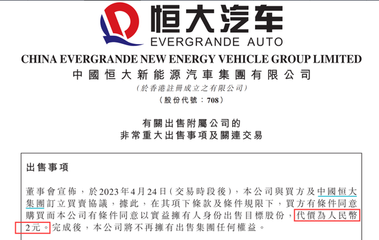 “预计本公司将录得出售收益约247.89亿元。因出售事项产生的出售收益为代价与出售集团于2022年12月31日的负债净值之间的差额。”恒大汽车在公告中称。