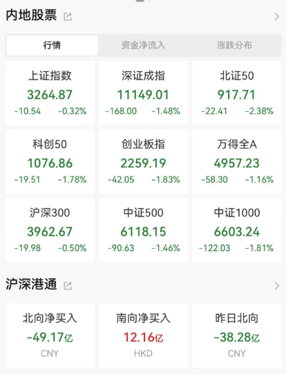 两市共850只个股上涨,4230只个股下跌,北向资金净卖出49亿元。