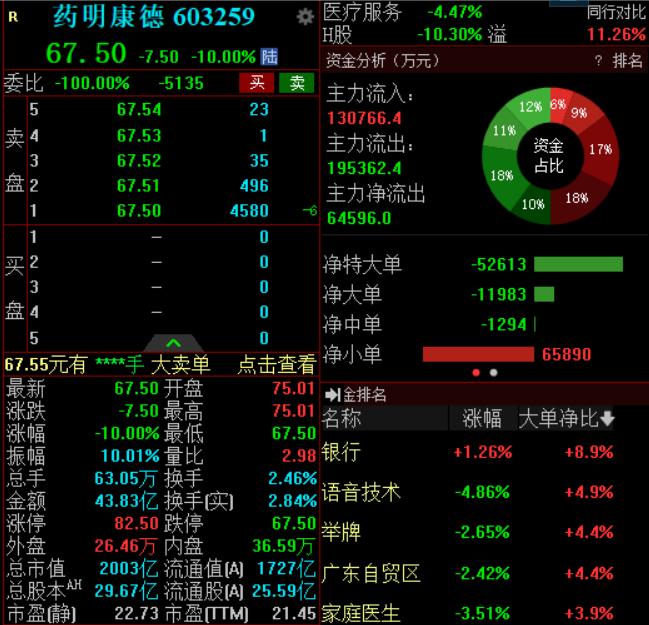 个股方面,药明康德(维权)触及跌停,报67.50元,创6个月新低,市值逼近2000亿元,成交额43.83亿元。港股药明康德跌超10%。