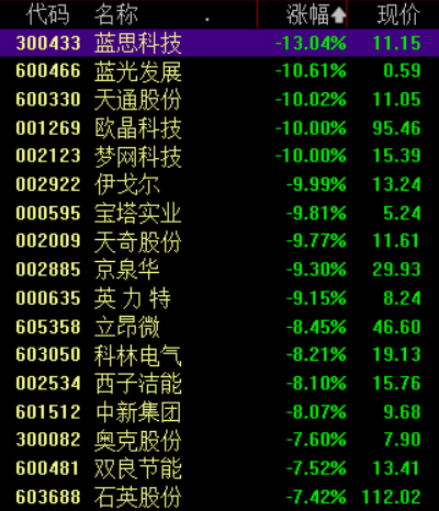 光伏板块持续寻底,蓝光发展、天通股份、欧晶科技等多股跌停,蓝思科技、英力特、科林电气等普遍低迷。