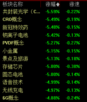 板块方面,两市仅银行板块逆势上涨,其余板块全线下挫,CRO概念、钠离子电池、旅游板块等跌超5%,语音技术、无线充电、6G概念等跌超4%。
