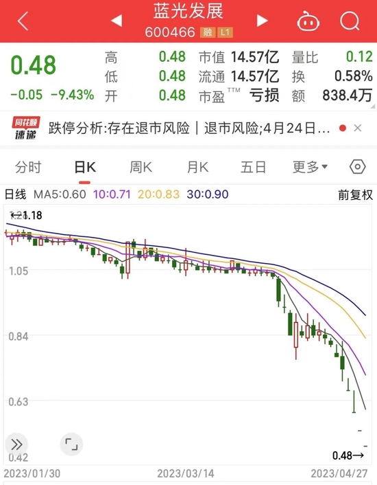 4月27日早盘,蓝光发展再次跌停,此前已连续3个跌停板。该股中午收盘价0.48元/股,封单超568万手,续创十多年来新低。