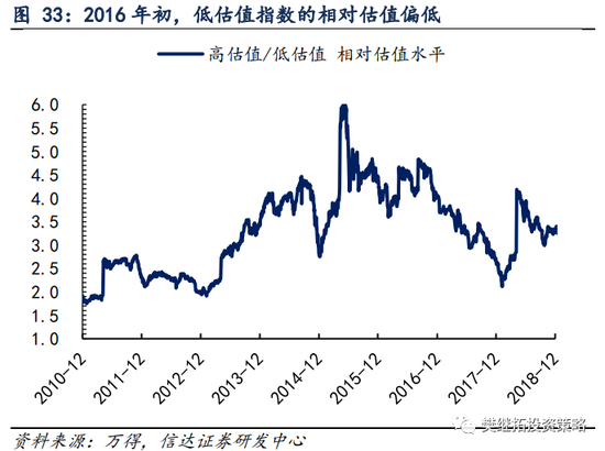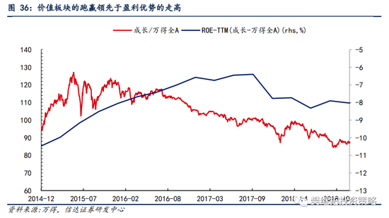 从ROE数据来看,成长板块相较万得全A的盈利优势在2016Q4-2017Q3上升斜率放缓,在2017Q3至2018Q2转为下降。虽然成长板块超额收益的走低领先于盈利优势的走低,价值板块超额收益的走高领先于盈利优势的走高,但事后来看,价值板块的跑赢是有基本面因素的支撑的。