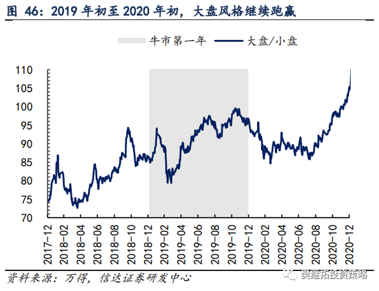 总结来看,机构投资者持仓占比的快速抬升构成这段时期影响大小盘风格的主要因素。2019年初大盘风格相对估值偏高、成长风格好于价值风格,这些因素未能扭转大盘风格的跑赢。