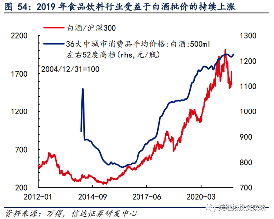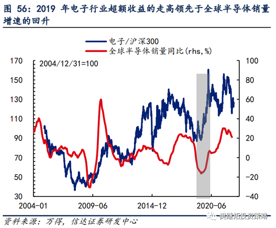 从需求视角来看,1)2019年全年宏观经济增速、上市公司盈利增速都未见明显回升,很多板块的ROE出现了持续下行,而消费板块的业绩稳定性较高。在这样的背景下,消费板块产生了较大的业绩相对优势。从产业层面上来,白酒行业仍处于复苏周期,高端白酒批价持续上涨;农林牧渔行业受益于“超级猪周期”而大涨。2)电子行业的上涨明显领先于全球半导体销量增速的回升,电子行业上涨的产业背景是中美贸易摩擦、国产芯片自给率提升迫在眉睫,政策支持叠加国内企业切入华为产业链,电子行业超额收益大幅走高。事后来看,国产替代的逻辑确实在2020年、2021年得到兑现,但电子行业却在2019年提前跑赢。这本质上还是源于,股市见底大幅领先于盈利见底,此时投资者会选择盈利预期好、产业空间广阔的成长股作为进攻方向。