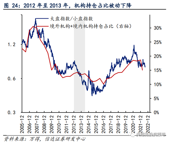 结合2013年的情况来看,1)投资者结构方面,2013年机构投资者的持仓占比由下降转为走平。对应的背景是,始于2007年的股权分置改革带来的限售股解禁使得产业资本持股比例走高,这一趋势从2008年持续到了2018年。2)市场风格方面,2013年成长风格明显跑赢,对大小盘风格产生影响。