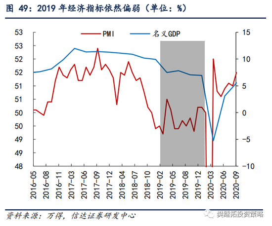 3)宏观经济增速方面,2019年全年的经济指标依然偏弱,直到2020Q2才出现复苏。