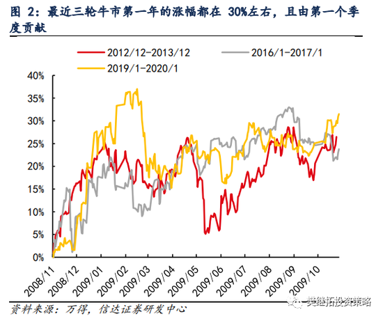 从累计涨幅来看,除2008年之外,其他牛市启动一年后的累计涨幅均在20%以上。将前期熊市的大部分跌幅基本收复。具体来看,2008/10/30-2009/10/30万得全A指数累计上涨106.15%,2012/12/4-2013/12/4万得全A指数累计上涨26.47%,2016/1/28-2017/1/28万得全A指数累计上涨24.59%,2019/1/4-2020/1/4万得全A指数累计上涨33.74%。
