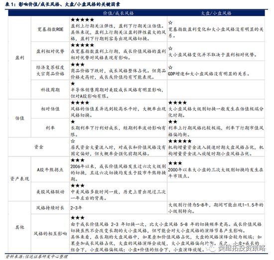 在我们此前的专题报告《价值成长风格切换的规律和主要影响变量》、《大小盘风格轮动的核心决定因素》中,我们系统梳理了影响价值/成长风格、大盘/小盘风格的关键因素。核心结论如表1所示。