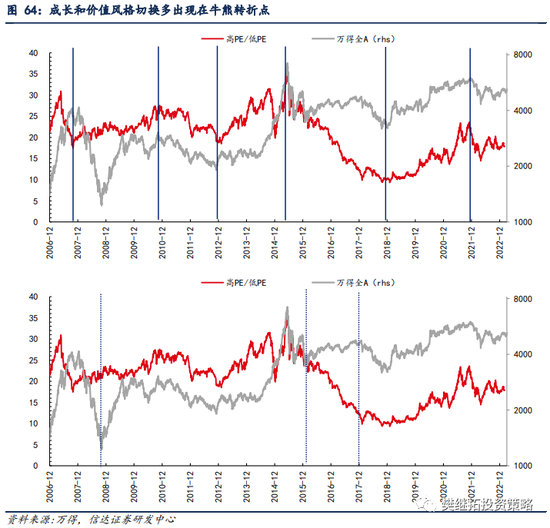 1)2006年以来,成长价值风格发生过六次大级别的切换,且这六次切换均发生于股市牛熊转换期,如图64中蓝色实线所示。具体来看,2007年底价值转向成长(股市牛转熊),2010年底成长转向价值(股市牛转熊),2012年底价值转成长(股市熊转牛),2015年中成长转向价值(股市牛转熊),2018年底价值转成长(股市熊转牛),2021年底价值转成长(股市牛转熊)。