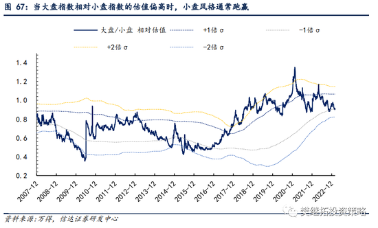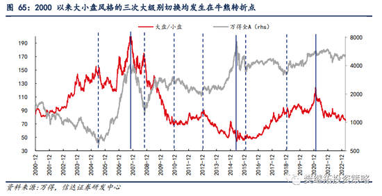 1)2000年以来,大小盘风格曾发生过三次大级别切换,这三次切换均发生于股市牛熊转换期,如图65中蓝色实线所示。具体来看,2000年至2007年小盘风格跑赢七年,2007年至2015年6月大盘风格跑赢七年半,2015年中至2020年底大盘风格跑赢五年半。这三次市值风格的大级别切换分别发生于2007年底(与此同时股市牛转熊),2015年6月(与此同时股市牛转熊),2020年底(与此同时股市由上涨转为高位震荡)。