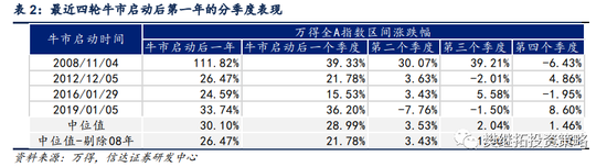 分阶段来看,牛市第一年的涨幅大多由第一个季度贡献(此阶段的上涨通常由估值驱动),而随后三个季度则偏向于震荡(此阶段的表现通常取决于估值与盈利的抗衡)。分季度来看,四轮牛市启动后一个季度的涨幅分别39.33%/21.78%/15.53%/36.20%,涨幅中值为28.99%。而随后的季度涨幅则在±10%以内,呈现窄幅震荡。考虑到2008年至2009年牛市的上涨较猛烈,与最近三次牛市表现存在较大差异,本文中我们主要研究最近三次的牛市情况。