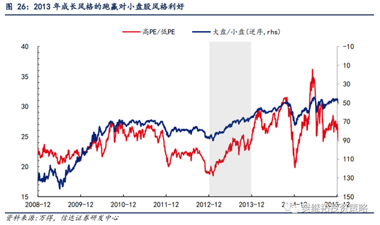 在第一章节中,我们提出在A股处于盈利上行周期时,某个风格的盈利优势对其表现至关重要。事后来看,2013年全年成长板块的跑赢主要受到移动互联网蓬勃发展的影响。