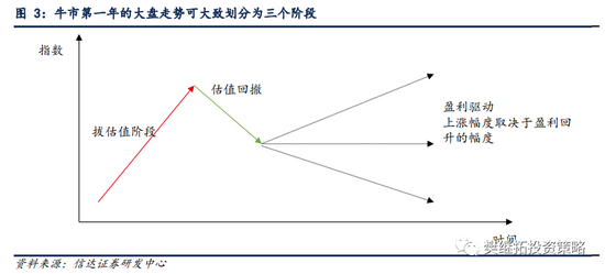 2.3 结合盈利与估值来看,牛市第一年的大盘走势可大致分为三个阶段