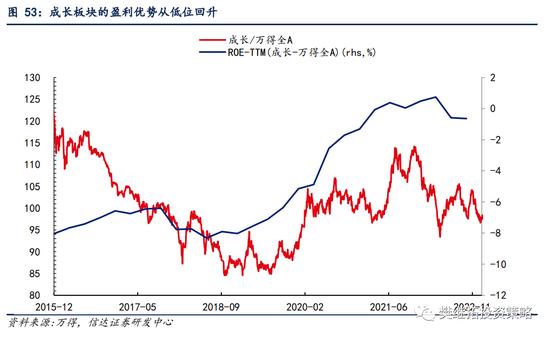 从ROE数据来看,成长板块相较万得全A的盈利优势在2018Q4-2022Q1走高,同期成长板块超额收益也从低位回升。