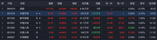 中国平安涨停的同时,其他保险股全线大涨。新华保险涨6.87%,中国太保涨6.66%,中国人寿涨6.45%,中国人保涨4.64%。