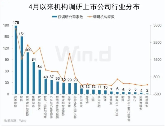 从机构家数来看,4月以来资本货物行业上市公司的调研机构家数合计达到3290家居首,占比19.07%,技术硬件与设备、软件与服务行业均有合计超2000家机构进行调研,热度颇高。