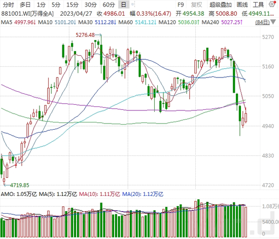 4月27日,万得全A小幅反弹0.33%,成交额为1.05万亿,较前一交易日略有减少,且连续18个交易日突破万亿。从技术图形上看,今日低开高走小幅反弹,触及5日均线后再度回撤,距五一长假仅剩一个交易日,多空双方均较为谨慎,短期市场或维持窄幅震荡走势。