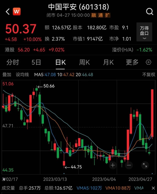 受一季度业绩大幅超预期影响,4月27日,中国平安高开高走,放量涨停,成交额达126.57亿元。