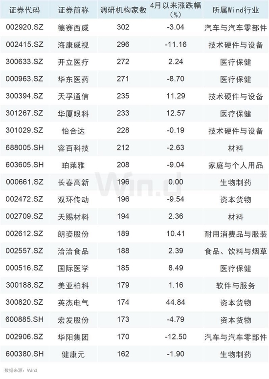 据Wind数据统计,在4月以来接受机构调研的880家上市公司中,共有50家上市公司获得超百家机构调研,占比5.68%。德赛西威4月以来获302家机构调研,位居榜首,海康威视、开立医疗、华东医药、天孚通信、华夏眼科、怡合达、容百科技、珀莱雅均获超200家机构调研。