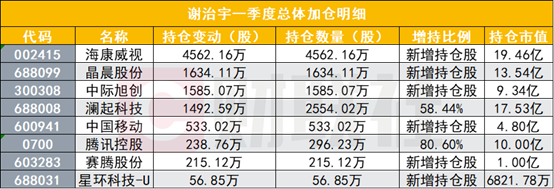 其中,张坤大幅加仓中国海洋石油,刘彦春则加仓海康威视、美的集团、腾讯控股,谢治宇布局AI板块,加仓海康威视、晶晨股份、中际旭创、澜起科技、中国移动、腾讯控股、赛腾股份、星环科技-U,常处于风口浪尖的葛兰,也开始布局人工智能,加仓同花顺、金山办公、寒武纪-U等概念股。