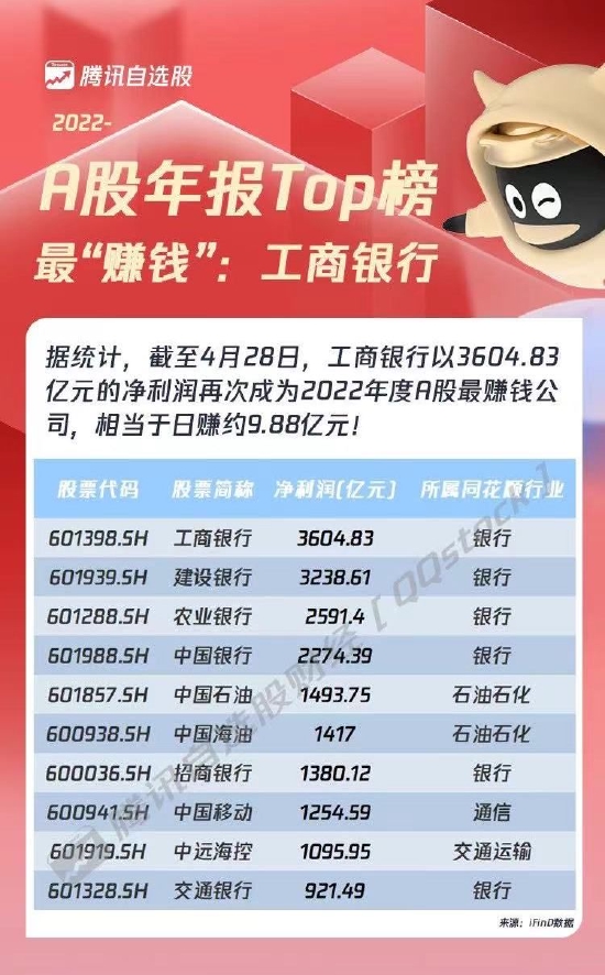 其中,工商银行以3604.83亿元的净利润再次成为2022年度A股最赚钱公司,相当于日赚约9.88亿元!此外,建行、农行中国银行2022年净利润紧随其后。