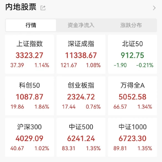 今日沪指低开高走,重返3300点上方,深成指、创业板指跟随上涨。截至收盘,沪指收涨1.14%,报3323.27点。深成指涨1.08%,创业板指涨0.76%。