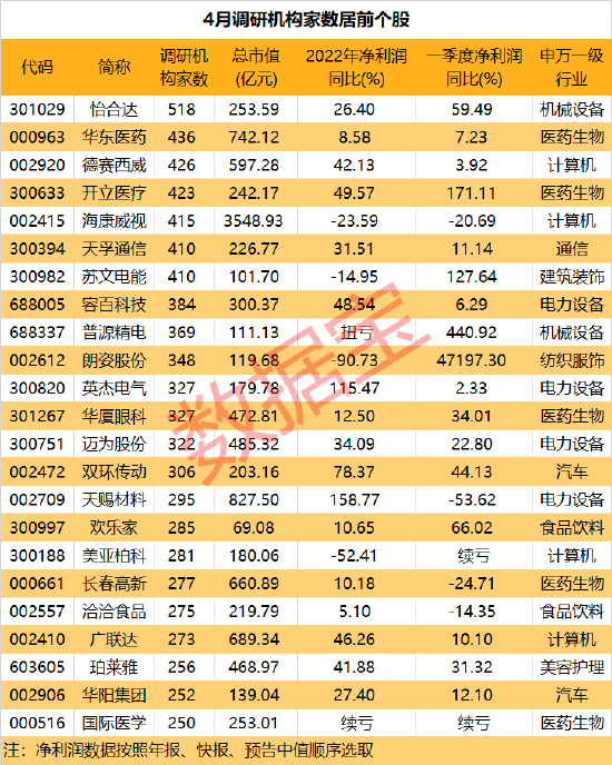数据宝统计,4月共计23股分别获得250家及以上机构调研。除怡合达外,华东医药、开立医疗等医药生物股,德赛西威、海康威视等计算机股热度较高,参与调研的机构均在400家以上。