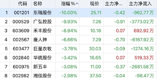 猪肉股跌幅居前,东瑞股份跌停,广弘控股跌超9%,唐人神、天康生物、巨星农牧跌幅居前。