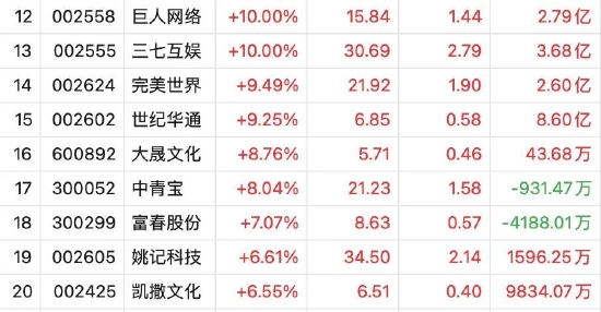 巨人网络、三七互娱、万达电影、博瑞传播、皖新传媒等多股涨停,蓝色光标、汤姆猫、彩讯股份、科大讯飞、中文在线、吉宏股份、掌阅科技等多股涨超8%。