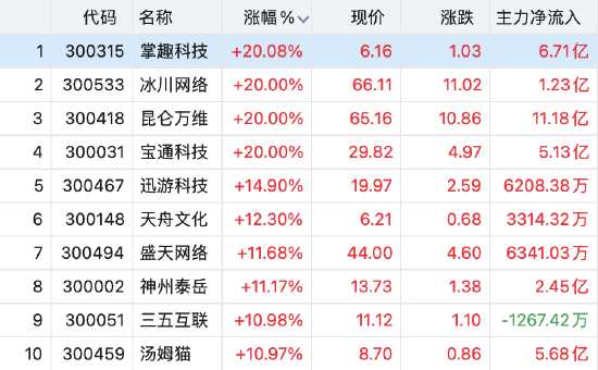 AI、游戏、传媒板块再掀涨停潮,昆仑万维、万兴科技、银之杰、汉仪股份、顺网科技、福昕软件、财富趋势20cm涨停。