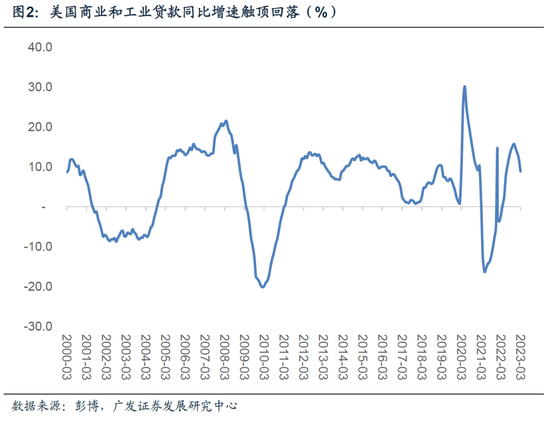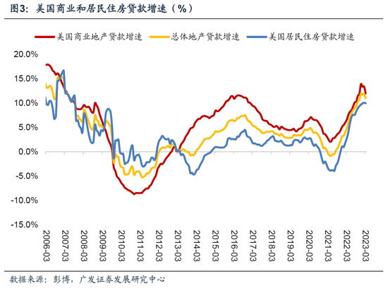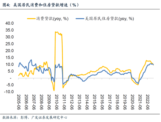 与此同时,虽然银行业倒闭风波暂告一段落,但中小银行储蓄转移+未来可能收紧的监管可能会导致信用紧缩,进一步影响实体经济。一则,美国小银行对信贷扩张的作用显著,在储蓄持续转移的背景下,美国中小银行大概率会收紧贷款标准,收紧金融条件,进一步冲击实体经济。根据美联储H.8表格,美国小银行对商业地产贷款、住宅地产贷款、商业和工业贷款、消费贷款的贡献分别达到70%,38%、34%和24%;此外,美国小银行和大银行贷款占其储蓄的比例分别约为80%和60%,可见小银行对信贷扩张的作用以及其积极性(参见3月30日报告《如何理解美国中小银行储蓄转移》)。现阶段,虽然恐慌性储蓄转移阶段已经过去,但若货币市场基金利率持续高于储蓄利率,则小银行储蓄下降的趋势仍会持续,叠加后续监管可能趋严,则小银行对信贷的贡献可能显著回落。可以看到,商业和工业贷款以及商业地产贷款增速开始触顶回落,居民消费和住房贷款在磨顶阶段,均反应金融环境收紧对信贷收缩的作用已经开始显现。