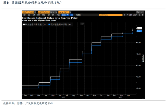 第一,在美联储2023年5月议息会议中,FOMC全体官员一致投票将联邦基金利率目标区间上调25bp,至5.0%-5.25%,符合市场预期,这是自2022年3月以来连续第十次加息、自年初以来第三次推进25bp的加息。