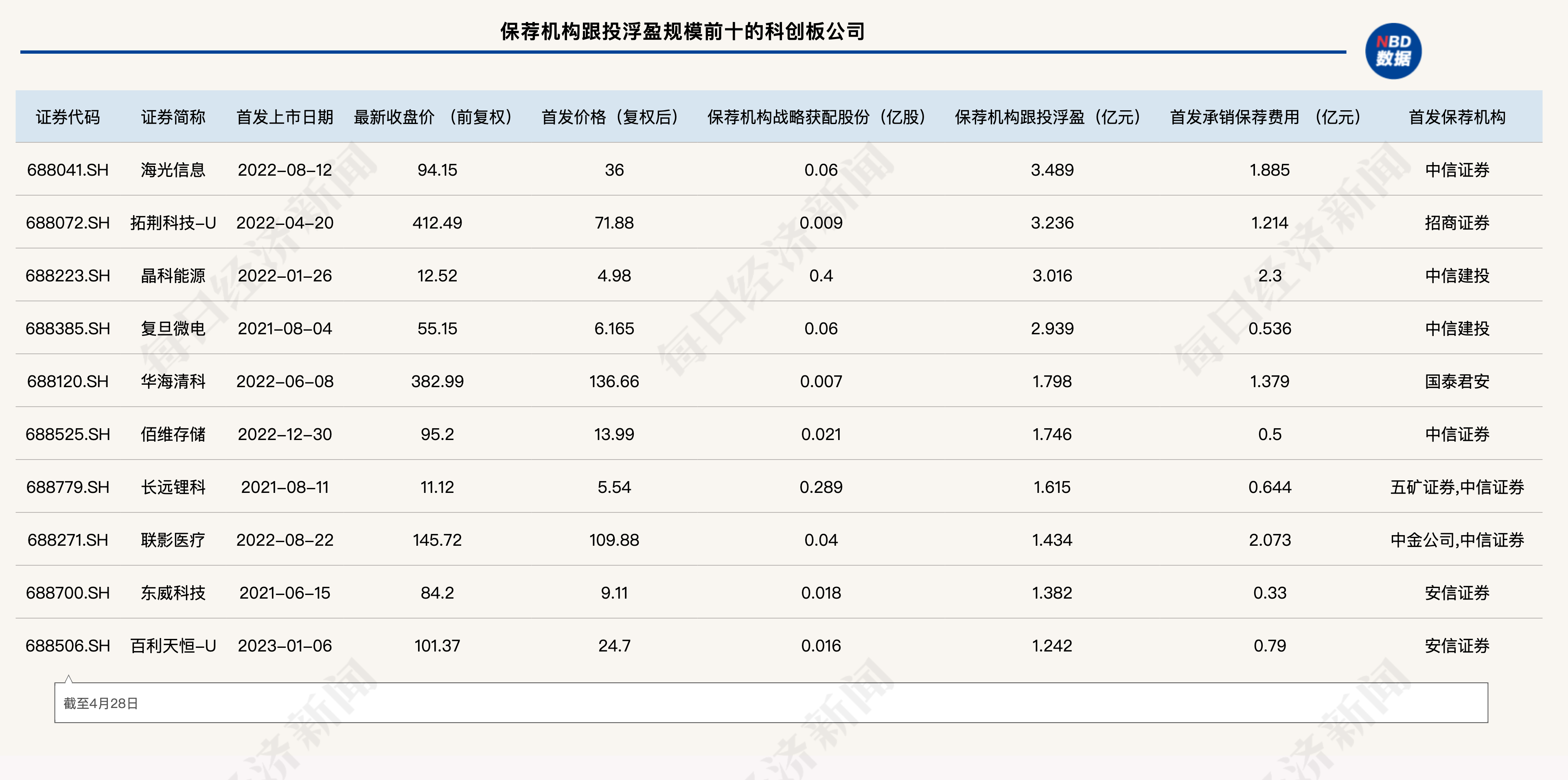 值得一提的是,截至4月28日收盘,甚至有38单科创板项目带给保荐机构的跟投浮盈超过了承销保荐费收入。其中,跟投浮盈与承销保荐费收入之间差值过亿的项目有复旦微电、拓荆科技-U、海光信息、佰维存储、东威科技5个,而这5个项目中有2个项目的保荐机构为中信证券。