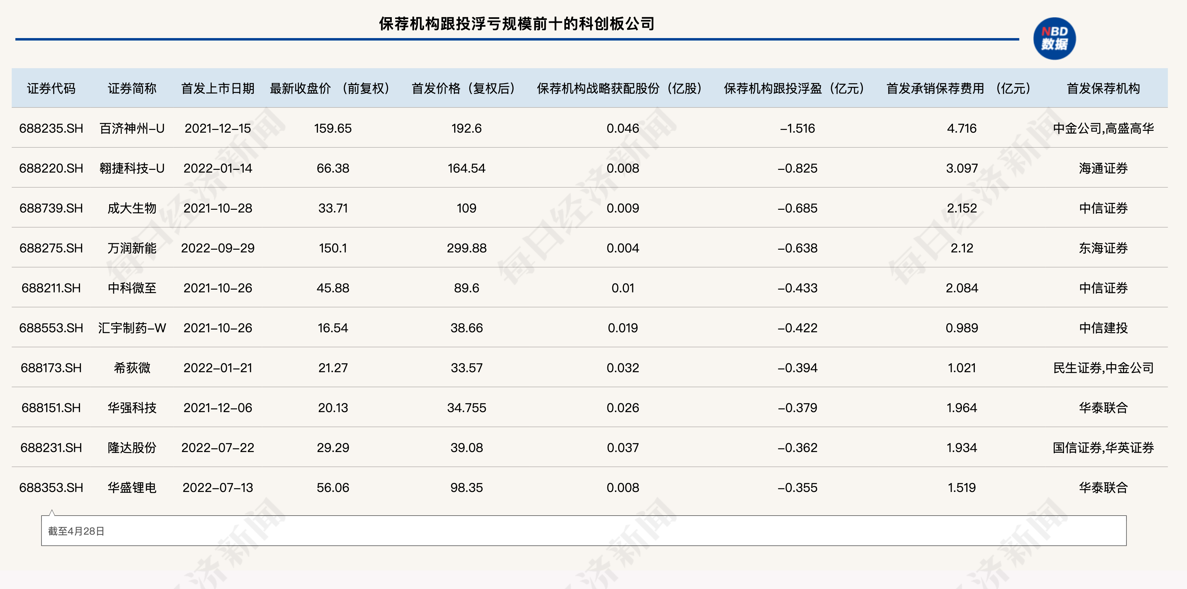 另据统计,目前还是有一些保荐机构的跟投浮亏规模不容乐观。据统计,截至4月28日,跟投累计浮亏规模超过千万的券商有东海证券、申万宏源承销保荐、高盛高华等,其中得益于保荐项目百济神州-U 4月大涨22%,高盛高华的浮亏规模从之前的过亿缩减至0.76亿元。