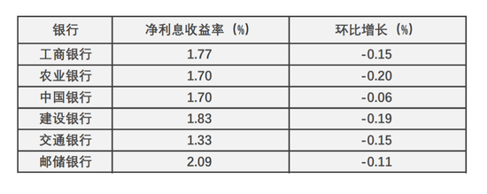 与此同时,今年一季度,六大行的净息差均延续了收窄的态势。工行、农行、中行、建行、交行、邮储一季度净息差分别为1.77%、1.70%、1.70%、1.83%、1.33%、2.09%,较上年末分别下降0.15%、0.20%、0.06%、0.19%、0.15%、0.11%。