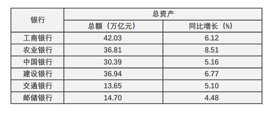 邮储银行、交通银行则分别以14.70万亿元、13.65万亿元的总资产分列第五和第六位。