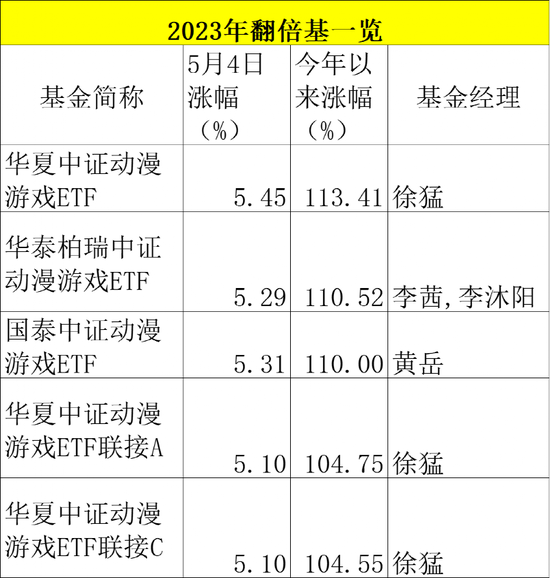 WIND资讯数据显示,截至5月4日,今年以来华夏中证动漫游戏ETF、华泰柏瑞中证动漫游戏ETF、国泰中证动漫游戏ETF、华夏中证动漫游戏ETF联接基金的净值增长率均超100%,让2023年出现了4只翻倍基。