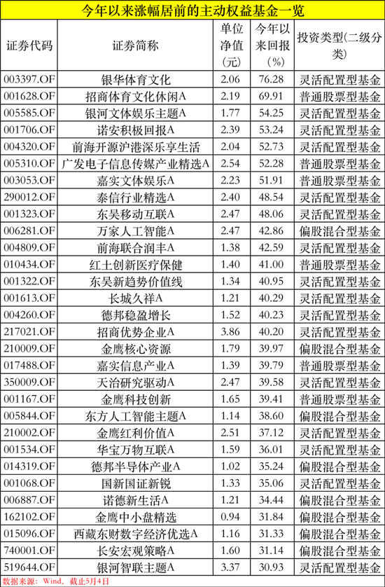 4月28日至5月4日,游戏板块继续高歌猛进,带动银华体育文化基金的年内净值涨幅达到76.28%,继续坐稳年内主动权益基金业绩第一“宝座”。