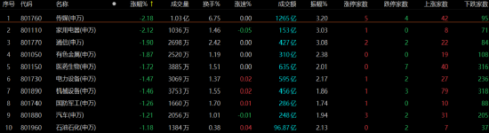 盘面上,31个申万一级行业中,仅6个行业板块收涨,房地产、银行、非银金融、食品饮料、社会服务等行业板块涨幅居前。下跌方面,传媒、家用电器、通信、有色金属、医药生物等板块跌幅居前。