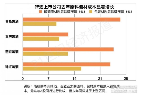 21世纪经济报道记者结合青岛啤酒、重庆啤酒、燕京啤酒、珠江啤酒近两年的采购项目计算,去年四家啤酒上市公司的酿酒原材料成本涨幅全都达到两位数,分别同比增长26.5%、12.4%、24.7%和23.8%;包装材料成本涨幅也接近或达到两位数,分别同比增长9.2%、9.9%、12.3%和15.9%。