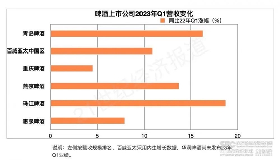 21世纪经济报道记者梳理后注意到,青岛啤酒、百威亚太、重庆啤酒、燕京啤酒、珠江啤酒、惠泉啤酒(600573.SH)、兰州黄河(000929.SZ)7家A股啤酒上市公司今年一季度均实现了营收、盈利双增长。