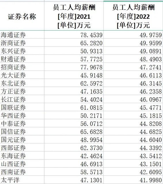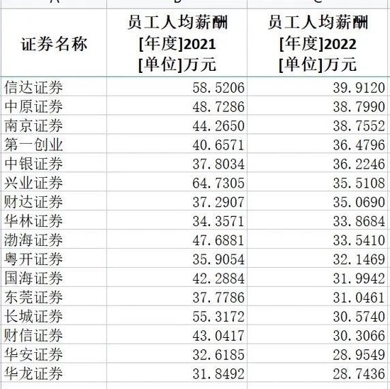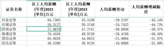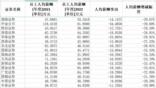 渤海证券、中金公司、财信证券、西部证券、华泰证券、西南证券、东北证券、国联证券、国海证券、天风证券、浙商证券、国金证券、广发证券、国都证券、中原证券、中泰证券降幅则超过20%。这其中只有中原证券因基数低,降薪绝对金额少于10万元。