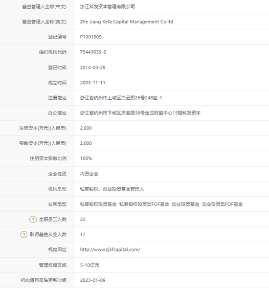 中基协备案信息显示,科发资本成立于2003年11月,2014年4月首批完成备案;目前管理规模在5亿元到10亿元之间。