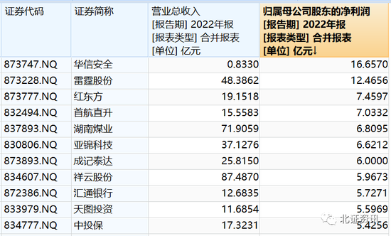 新三板企业整体降本增效的同时,头部企业引领成长。2022年有346家挂牌公司净利润超5000万元,共创造净利润421.71亿元,利润水平约占盈利公司的五成左右,平均净资产收益率15.09%,净利增速41.16%,成为中小企业中高盈利、高增长的代表。Wind的数据显示,华信安全、雷霆股份2022年净利润超过10亿元,红东方、亚锦科技、首航直升、湖南煤业、汇通银行、天图投资等去年净利润也均超过5亿元。