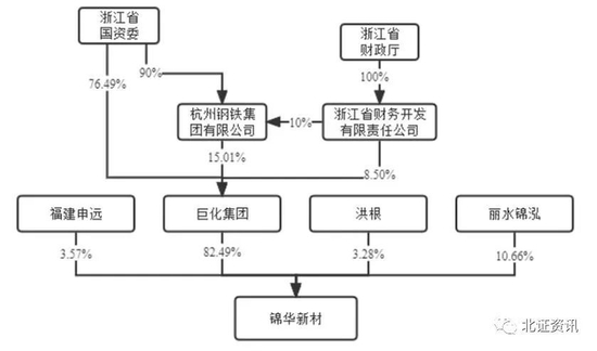 申报稿显示,锦华新材是一家地方国资企业。巨化集团有限公司直接持有公司7918.75万股股份,占公司总股本的比例为82.49%,为公司的控股股东。浙江省国资委直接持有公司控股股东巨化集团76.49%股份,通过杭州钢铁集团有限公司间接持有巨化集团13.51%股权,共计持有巨化集团90.00%股权。公司的实际控制人为浙江省国资委。
