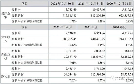 泰和新材2021年实现盈利11亿元,2022年前9月净利润为3.4亿元。泰和兴表示,除2022年1-9月,公司利润总额及净利润占泰和新材比重超过5%以外,报告期泰和兴对泰和新材其他相关数据占比影响较小。