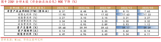 3)盈利能力方面,23Q1全A股(非金融石油石化)ROE下行,资产负债率和周转率下降,净利率提升。23Q1 全A(非金融石油石化)ROE(TTM,整体法)为7.63%,较22年的8.15%下降0.52pct,已连续三个季度下滑,主因资产负债率和周转率下降;