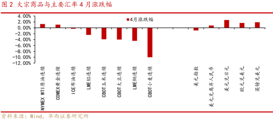 大宗商品方面,国际原油先扬后抑,黄金价格继续上行。截至4月末,WTI原油上涨1.27%、ICE布油下跌0.33%;COMEX黄金上涨1.07%;LME铜、铝分别下跌4.42%和2.40%。外汇方面,美元指数区间震荡,美元兑离岸人民币窄幅波动,整体平稳,外资小幅流出A股。
