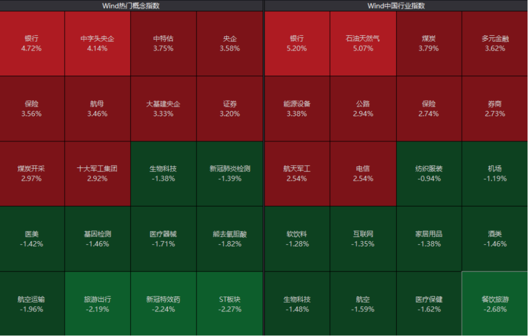 板块方面,中字头全线爆发,银行股持续走高,中国银行、中信银行纷纷涨停,证券板块午前发力,油气、煤炭、军工等板块表现活跃;而餐饮旅游、白酒、医美等跌幅居前。